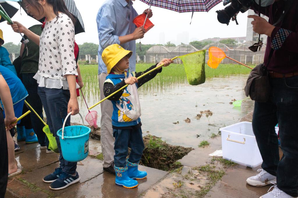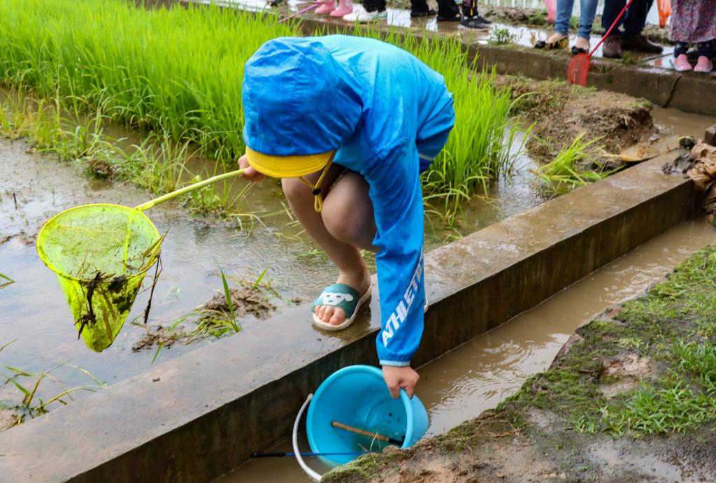 随后,小朋友们在家长的帮助下体验了趣味捉泥鳅活动,他们利用抄网、小桶等工具亲自动手,从水田中捕捉小泥鳅和小龙虾,家长也热情满满地参与到活动中。活动最后,小朋友们还获得了结课证书。最后,大家带着满满的欢乐,踏着初夏细雨回家。
