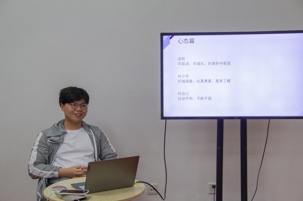 1705班的毕业生洪宇杰主要分享求职过程中的一些经历和经验方法。针对他大四就进行求职的选择,他表示,找到真正适合自己的事情很重要,他是在深思熟虑之后才做出的这一选择。“公司想要什么样的人?”他表示,这是一个求职者最应该想好的问题。他指出,公司需要的是符合岗位要求,能稳定在公司工作的人。随后,结合自己的求职经历,从心态调整、简历制作、面试技巧以及问题准备几个方面为大家进行了详细的介绍。最后,他强调,当选择好自己的道路后,就要积极迅速地投入到其中去,“做好一件事首先就是要先开始去做。”