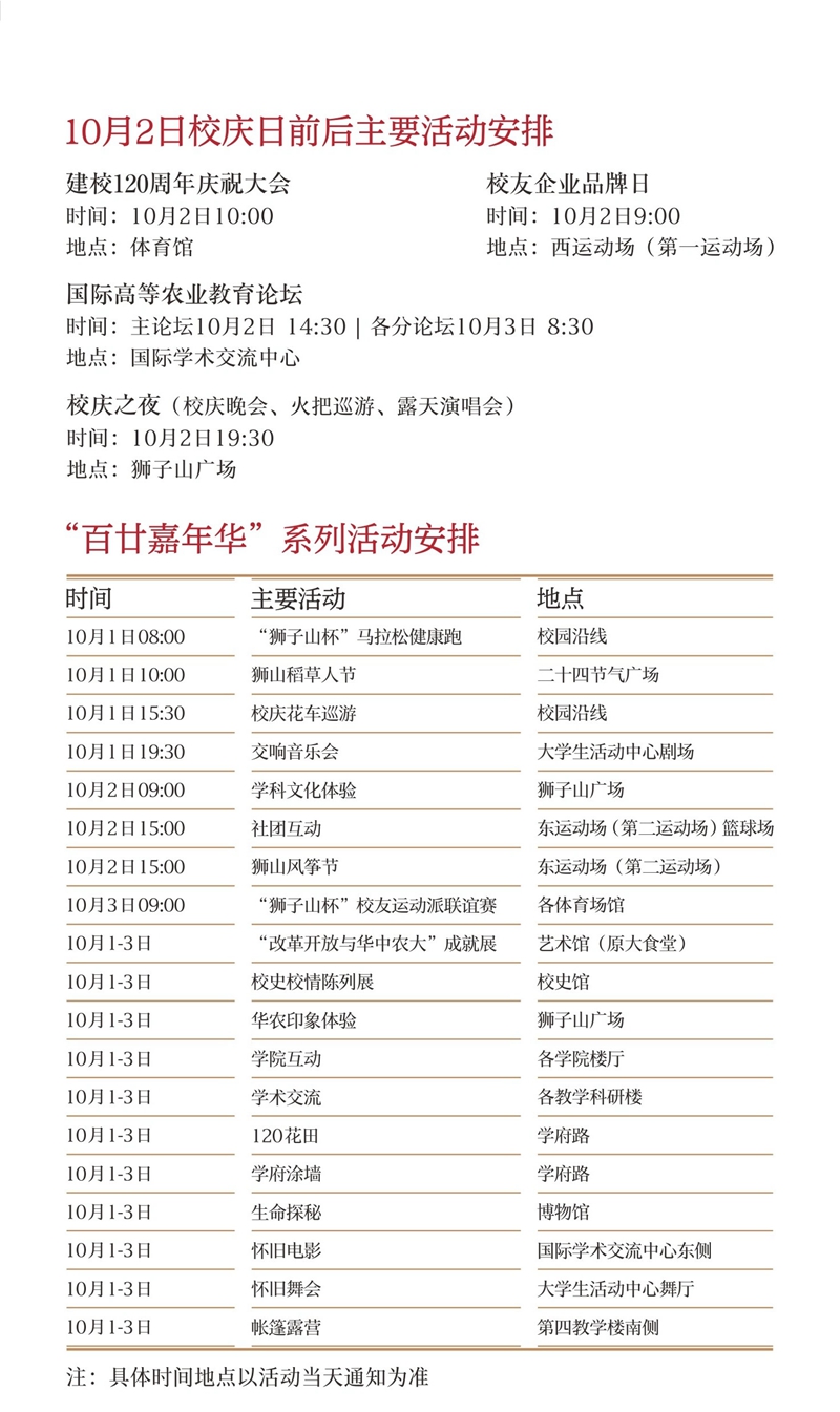 10月2日,学校将隆重举行建校120周年庆祝大会,同时,举办国际高等农业教育论坛、校友企业品牌日活动、“校庆之夜”大型晚会、火把巡游、狮子山广场露天演唱会等活动。此外,10月1日至3日,学校还将举办盛况空前的“百廿嘉年华”系列庆祝活动。学校期盼广大校友届时重返母校,共话狮子山下的美好岁月,共同见证120周年校庆盛况。