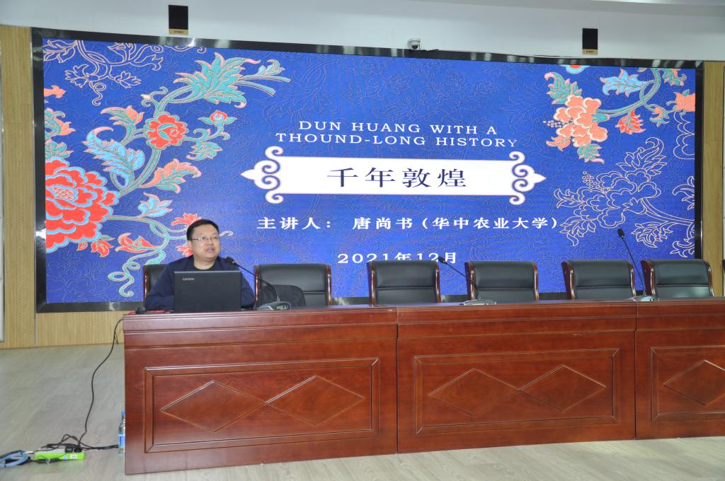 “敦煌古称沙洲。是丝路千古重镇,联通中外,融汇东西。千百年来,它历大漠风沙屹立不倒,经长河百战处变不回。”唐尚书从历史、文书、美术以及创意等四个方面向同学们介绍敦煌的文明更新之路。“敦煌乃吾国吾民之文化伤心史。”从敦煌的由来到莫高窟的出现,唐尚书以生动的语言讲述着那个时代的故事。“敦煌艺术欣赏有三个境界——始惊、次醉、终狂。”唐尚书通过图片依次向同学们分享了敦煌艺术欣赏要经历的阶段。“守住前辈的火,开辟明天的路。一腔爱,一洞画,一场文化苦旅,从青春到白发。心归处,是敦煌。”唐尚书鼓励同学们努力学习,期待未来在华农相遇。