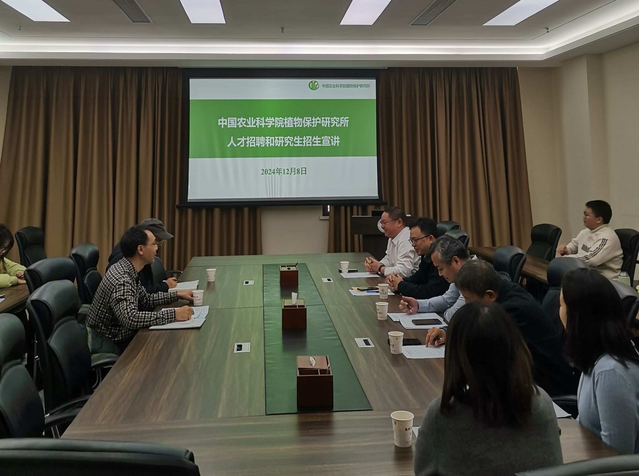 12月8日,中国农业科学院植物保护研究所招生引才宣讲会在第三综合楼B308顺利举办。植保所副所长刘文德、研工处处长王恩涛、人事处副处长刘博、华中农大校友曹坳程、周焕斌、陈淑宁研究员参会并做分享,植科院副院长罗朝喜主持,博士后及本研同学参会。