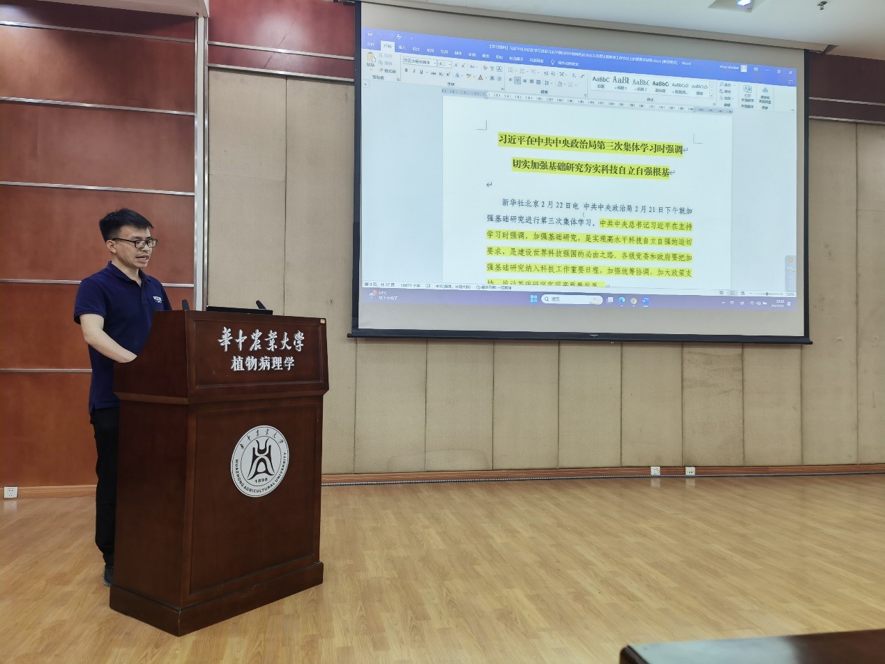 植物保护党总支书记黄俊斌结合自身学习体会谈到,解决农业产业“卡脖子”问题,实现科技自立自强,必须做有组织的科研,瞄准国际科学前沿和国家重大战略,立足服务国家和农业发展需求,做有用的科学研究,形成重要的应用成果。姜道宏表示,通过学习深刻认识到,所有的创新都需要经历原始创新、技术创新、产品创新和商品创新的过程。作为科研人员,我们要勇于提出新理论、新技术。我们要将习近平总书记的鼓励和希望转化为前进的动力,将科学研究与教书育人高度融合,将科技小院的育人模式应用在育人过程中。随后,党支部青年教师先后发言,纷纷表示要勇于奋斗,践行“螺丝钉”精神,聚焦国家重大需求,从产业需求入手有组织推进基础研究和应用研究。