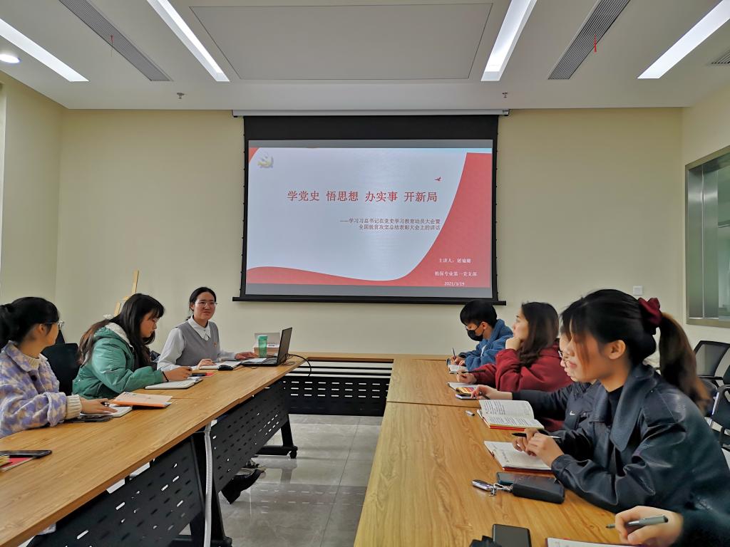 会上,屠瑜璐同志围绕不忘初心学党史、以史为鉴悟思想、牢记使命办实事、锚定目标开新局四个方面的内容展开领学。首先,她以中国共产党成立以来的三个主要阶段和重大历史事件为脉络带领大家回顾了我党筚路蓝缕奠基立业、创造辉煌开辟未来、矢志践行初心使命的百年历史。她谈到“要深刻体悟重大历史事件背后的核心思想,更好正本清源,固本培元。”随后,她列举全国脱贫攻坚取得的成就,重述共产党人真抓实干不怕艰辛的精神毅力。她指出:“锚定目标开新局,要把握机遇,直面挑战,主动作为,狠抓落实。落实到大学生来说,我们要扣好人生第一颗扣子,用自己最大的努力学习理论知识和专业知识,在未来做一个为国家办实事的人。”