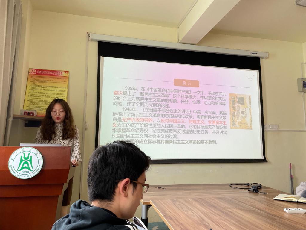 第一党小组的刘凯欣同志首先介绍了新民主主义革命的定义、性质和目标,同时从近代中国国情和中国革命的时代条件总结了当时的历史大背景。随后她从大革命时期、土地革命时期、抗日战争时期、解放战争时期讲解了新民主主义革命的革命历程,并对新民主主义革命的历史意义和基本经验进行了总结。袁颖同志则以南京大屠杀为切入点分享了她对于新民主主义革命史学习得感悟。汪芷璇同志带领党员同志们学习习近平总书记在福建考察时关于开展党史学习教育的重要指示精神和校党委书记书记高翅在党史学习教育中提出的四点要求。