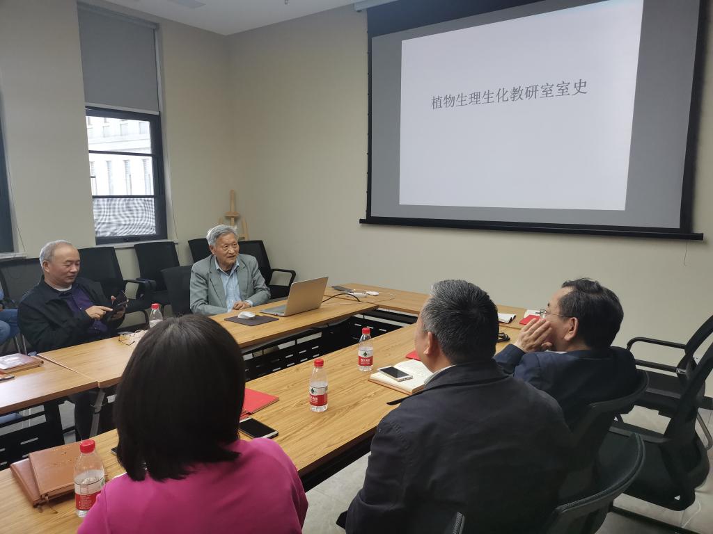 最后,62年党龄的老党员李合生老师给生理生化教研室的党员和老师们作了题为 “植生教研室发展史”的报告。李合生介绍了生理生化教研室的历史。1952年全国高等院校院系调整时华中农学院成立。当时学院缺植物生理学教师, 便聘请武汉大学生物系陈权龙先生兼授全院的农学、植保、园艺、土壤农化等专业的植物生理学课程,。1954年9月为全院有关专业分别开出植物生理学课程及其实验课, 并编写出植物生理学教材及植物生理学实验指导书,基本能按当时教学大纲提出的要求开出该课程。1956年成立植物生理教研组, 隶属于植物保护系,组长是金聿, 教师有辜明铭、郑瑞荣、蔡翠云等。此后还有施克俭、黄贻昌入室工作。1960年植物生理教研组改由农学系领导。1970年,“文化大革命”后, 植物生理教研组教师分散在总院 (狮子山)、黄冈分院、宜昌分院开展教学、科研活动。1979年, 各分院从黄冈、宜昌搬迁回武汉狮子山总院,组建了植物生理生化教研室,由刘道宏任主任,周守祥、李合生任副主任。1984年至1998年植物生理教研室由李合生任主任, 徐竹生、施克俭任副主任兼实验室主任。2000年后历任室主任为陈翠莲、曾汉来、王学奎、朱龙付、丰胜求。至今全室教师达23名, 全部具有博士学位。