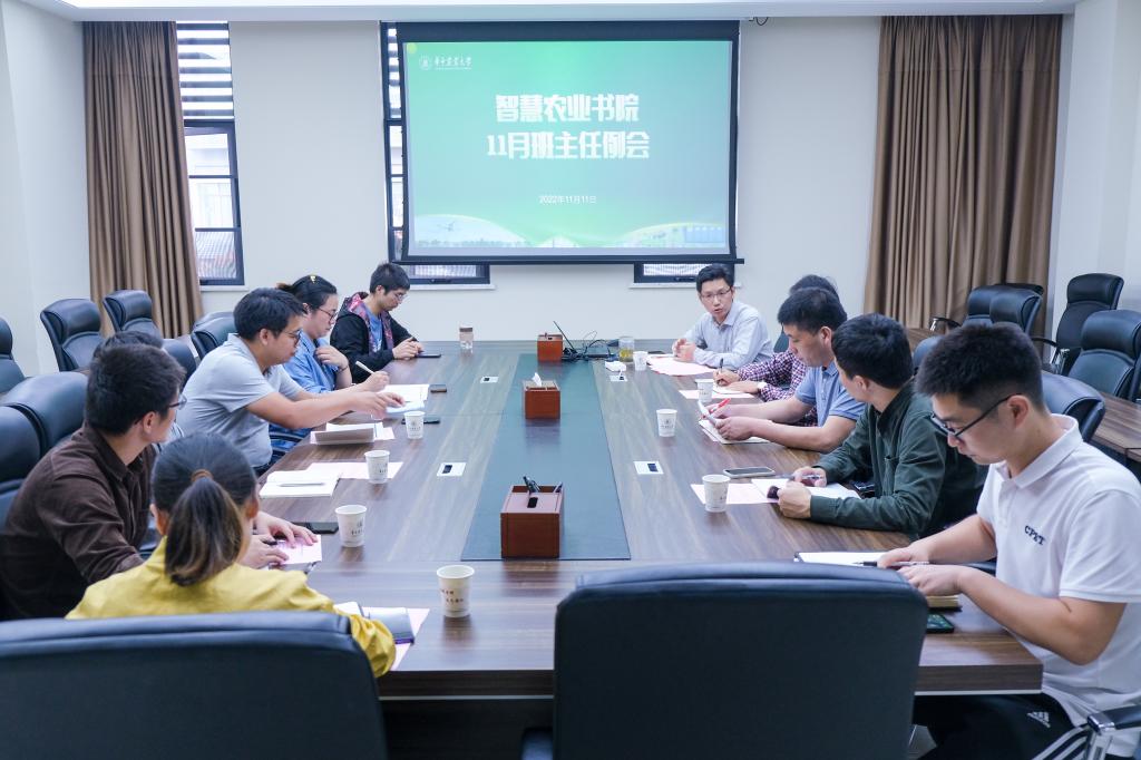 11月11日,智慧农业书院在三综B308举办11月班主任例会。书院院务委员会副主任王春潮、罗朝喜、孙超,书院班主任、教务员、辅导员与会,会议由孙超主持。