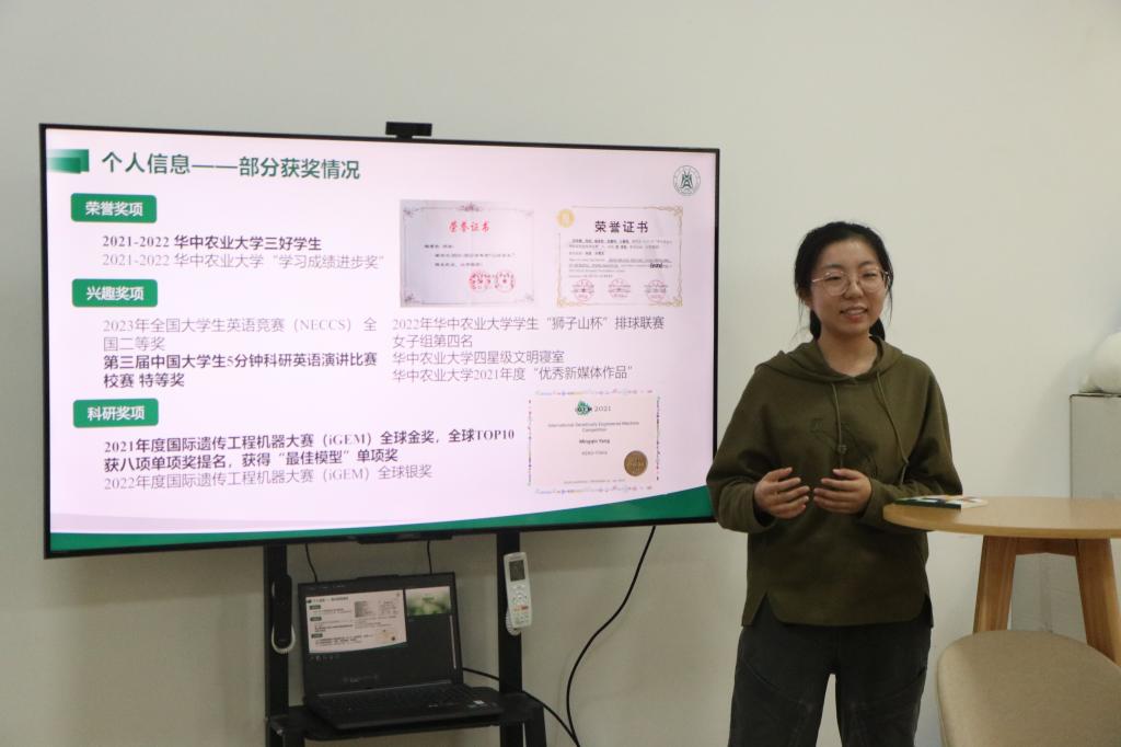 随后,保研至上海交通大学的杨茗钦主要讲述了其参与第三届中国大学生5分钟科研英语演讲比赛和国际遗传工程机器大赛(iGEM)的经历。她谈到,在进行科研的道路上难免会遇到意想不到的挑战与挫折,在困境面前,我们需要坚定自己的信念,把握当下时光,保持自己的节奏以寻求突破。杨茗钦以“怀念+迷茫、奋斗+绝望、坚定+坚持”形容并复盘她的大学生活,“在触摸里奔跑,在黑夜里舞蹈”她将这句话送给大家,并鼓励同学们认真学习英语,及早做好专业规划以在大学生活中“收获满满”。