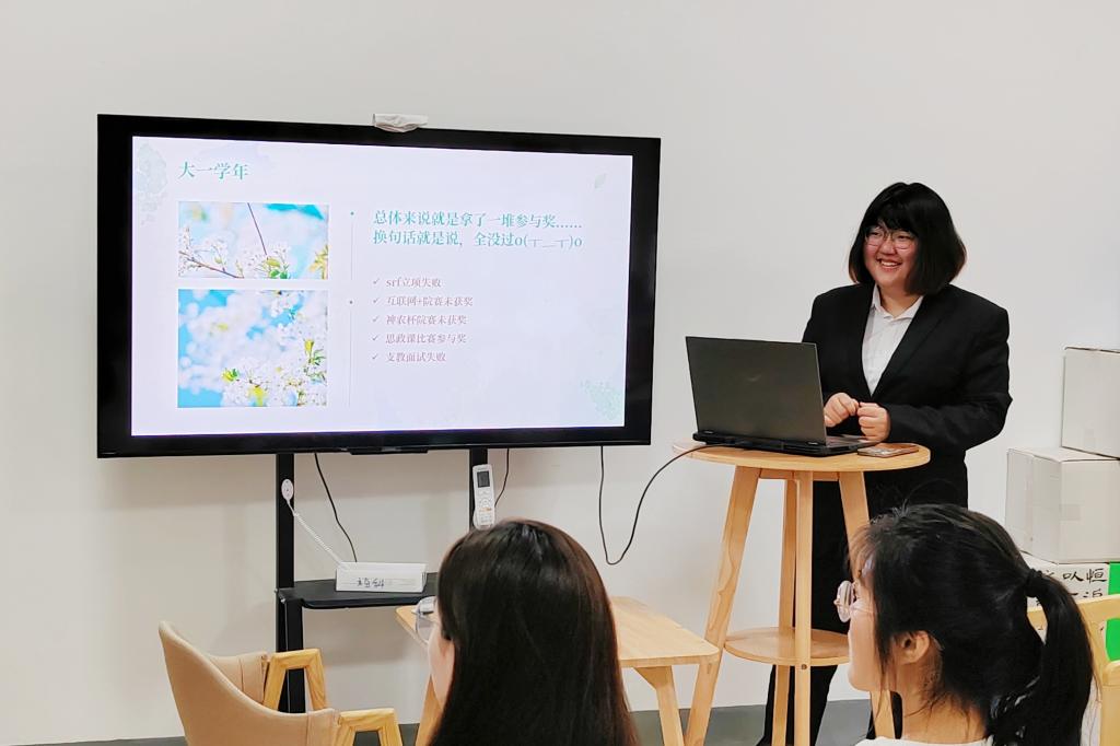 随后,保研至北京师范大学的李津莹以“甘于平凡,拒绝平庸”为切入点,介绍自己在不断经历竞赛失败后,清楚地认识到自己的目标并为之付出努力,最终取得了不凡的结果的心路历程。她以自身的行动诠释“坚持”,并将“不以结果论成败”作为自己的人生信条以成就更好的自己。