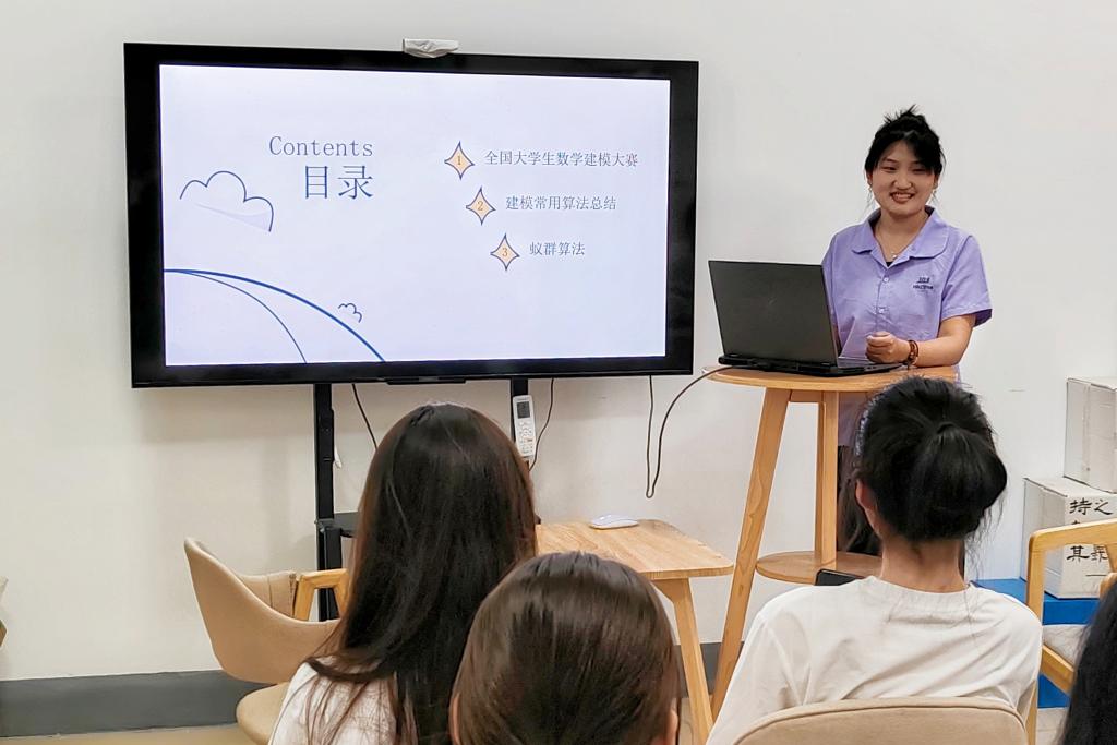 活动伊始,胡鸿岩以自己大一“意外”获得数学年级第一的趣事引出了她对数学建模大赛的相关介绍。从“全国数学建模大赛的训练经历”“建模常用算法总结”和“蚁群算法”三个部分,胡鸿岩向同学们详细系统地介绍了数学建模大赛的相关信息,并结合自己备赛过程中的有趣经历从选题、组队等方面给同学们提出了相关建议。