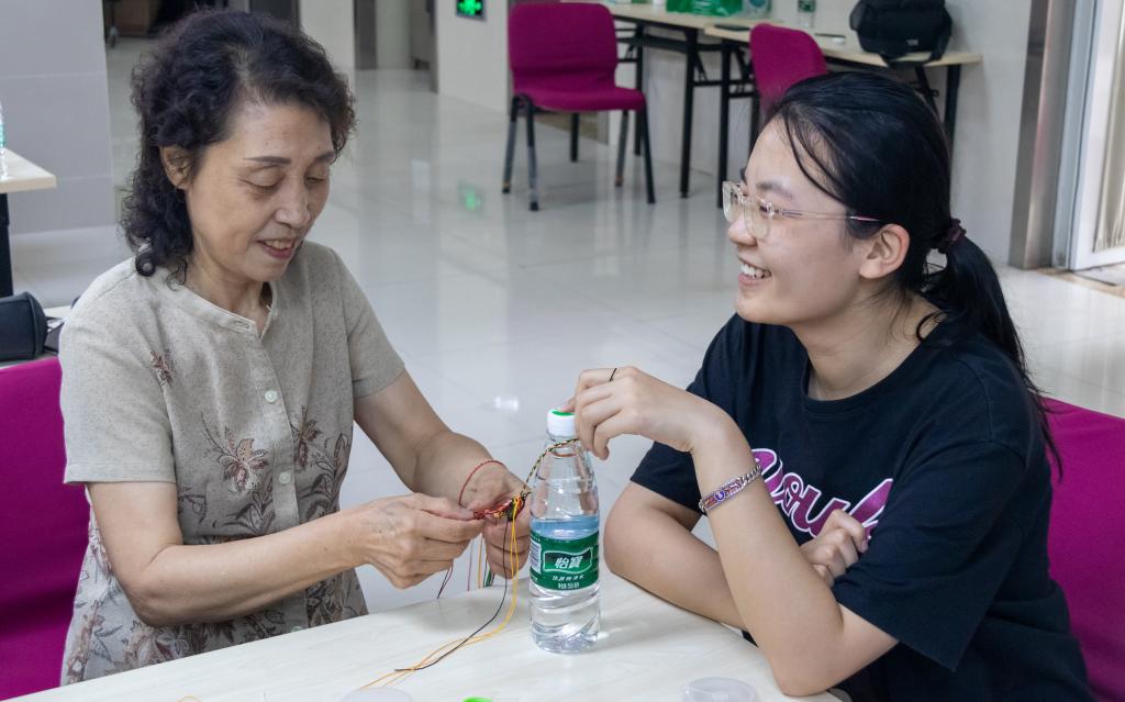 随后,志愿者同学带领退休教职工们体验编五彩绳。“五彩绳又称五彩丝,五色丝等,由青、黄、赤、白、黑五种颜色的线缠绕编织而成,一般在端午节佩戴五彩绳以辟邪,兼有祈福纳吉的美好寓意”志愿者同学们细心讲解,同时提供协助,和老同志们一起尝试五股编、十股编等多种编织方法编织五彩绳。五彩绳制作完成后,老同志们和志愿者同学们一起将编好的五彩绳系在充满端午元素的小饰品上,现场氛围变得热闹而又温馨。退休教师邹矛激动地说道:“五彩绳承载了人们对美好生活的祈愿和祝福,每当一根根丝线被编织成一条完整的五彩绳时,我都能感受到一种成就感和喜悦,通过亲手编织五彩绳,我感受到了端午节传统文化的魅力。”