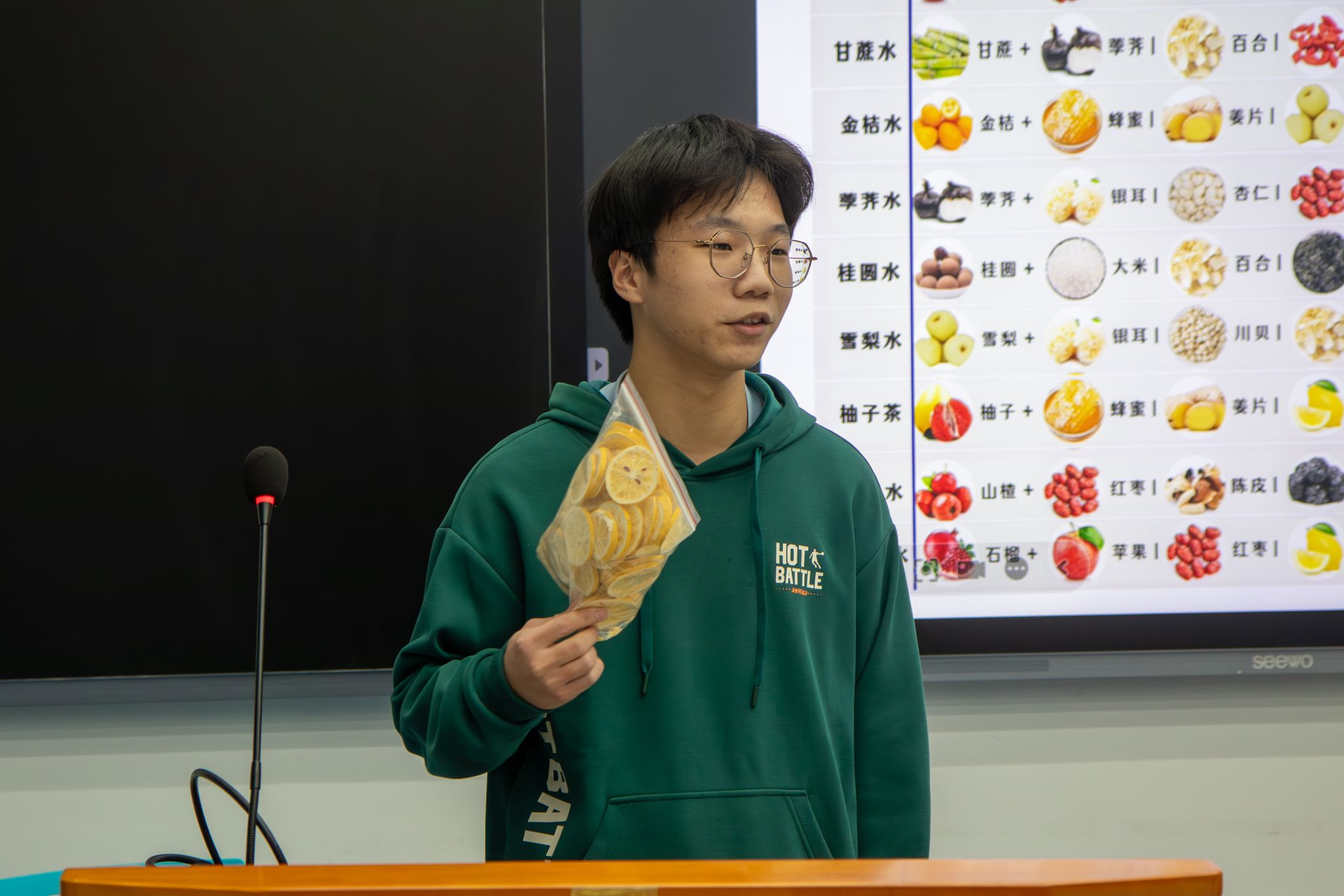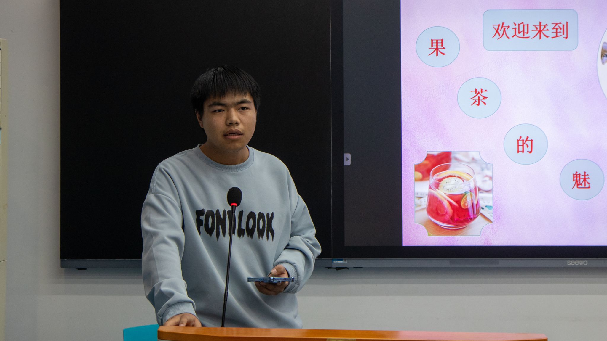 “水果和茶叶所含的维生素、矿物质、抗氧化物质等有益人体健康,可以增强免疫力、促进消化和美容养颜。”活动伊始,智慧农业2405班司小龙向大家介绍了活动背景、目的和流程安排,通过展示各类果茶的图片和实物,详细阐述了纯水果茶、混合水果茶、含茶底果茶等各种果茶的制作方法,并深入剖析了猕猴桃、桑葚、菠萝、大枣、蜜桃、香橙、柠檬、香梨等果茶原材料的营养价值。