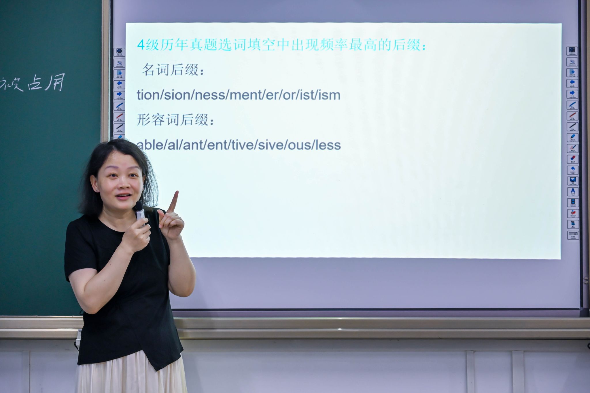 陈婷结合选词填空“词性识别法”,对词汇类题型展开讲解。她强调,后缀是判断词性的核心线索,要对词汇构成规律熟练掌握。通过现场真题演练,陈婷带领学生实践如何通过“冠词+形容词+名词”结构快速定位词性,结合语义锁定答案。