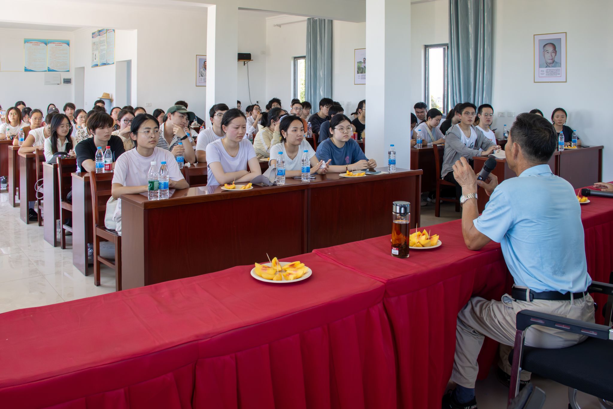 下午,师生前往汉川市黄桃种植基地调研学习。座谈会上,湖北园博生态种植专业合作社负责人严同元对师生到访表示欢迎,并介绍了当地农业发展情况。严同元表示,垌塚镇虽地处汉川市西北角,存在水资源相对匮乏、地形复杂等制约因素,但当地优质红壤富含多种微量元素,为桃树生长提供了独特条件。合作社因地制宜,重点发展“锦绣黄桃”“锦冠”“金美人”等优良品种,目前年产量已达数十万斤。同时,合作社积极发挥示范作用,通过科普展厅建设与专家技术培训等方式,为周边农户提供支持,有效带动了区域农业经济发展与农民增收。