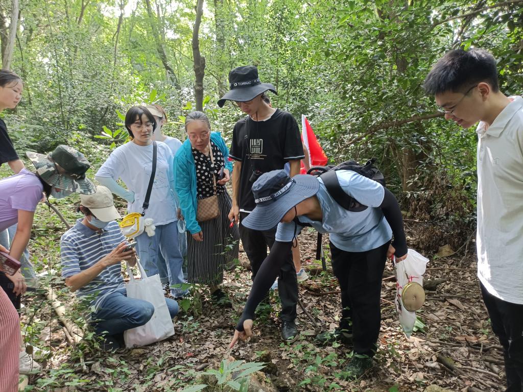 活动开展时,狮子山上已经历了一周的阴雨天气,环境非常适合野生蘑菇的生长。蘑菇散落在狮子山各处,枯木上、落叶下、杂草边都隐藏着它们的身影,它们也在狮子山上扮演着重要的角色。在老师和博士们的带领下,大家一头扎进狮子山丛林中,全然不顾闷热的天气和丛生的草木,兴致勃勃地踏上觅菌寻虫之路。