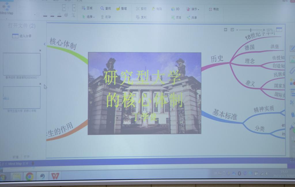 会议伊始,陈曙表示各种办公软件可以成为同学们工作学习的利器,合理使用这类软件可以做到提速,增效,节约时间。学生骨干不仅需要认真学习还需要做好学生工作。所以提高工作效率正是学生骨干的迫切需求。当陈曙打开他的培训文件,同学们惊奇的发现它并不是我们所常用的PPT,而是一张思维导图。他认为使用思维导图为同学们授课,画面更加简洁,逻辑更加清晰,想象发挥的空间更大。