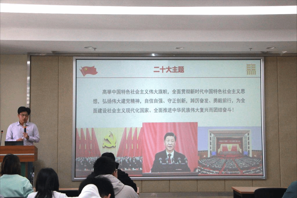 会议伊始,姜子岳从党的二十大的重要性着手,对二十大报告的基本框架进行了解读。他从人口变动到乡村建设,再到经济、教育等方面回顾了过去十年中国的伟大成就,并联系历史与当下分析了马克思主义中国化理论新境界的内涵。以中国式现代化的特征和本质要求为切入口,强调了未来5年对全面建设社会主义现代化国家开局起步的关键作用,并将“两个务必”与“三个务必”进行比较,总结出后者对前者的传承与发扬。学习结束后,他谈道:“作为一名华农青年,我们更应该深入学习习近平总书记给本禹志愿服务队的回信精神,以华农学长徐本禹为榜样,践行与祖国同行,为人民奉献精神,助志愿文化在我校代代相传。”