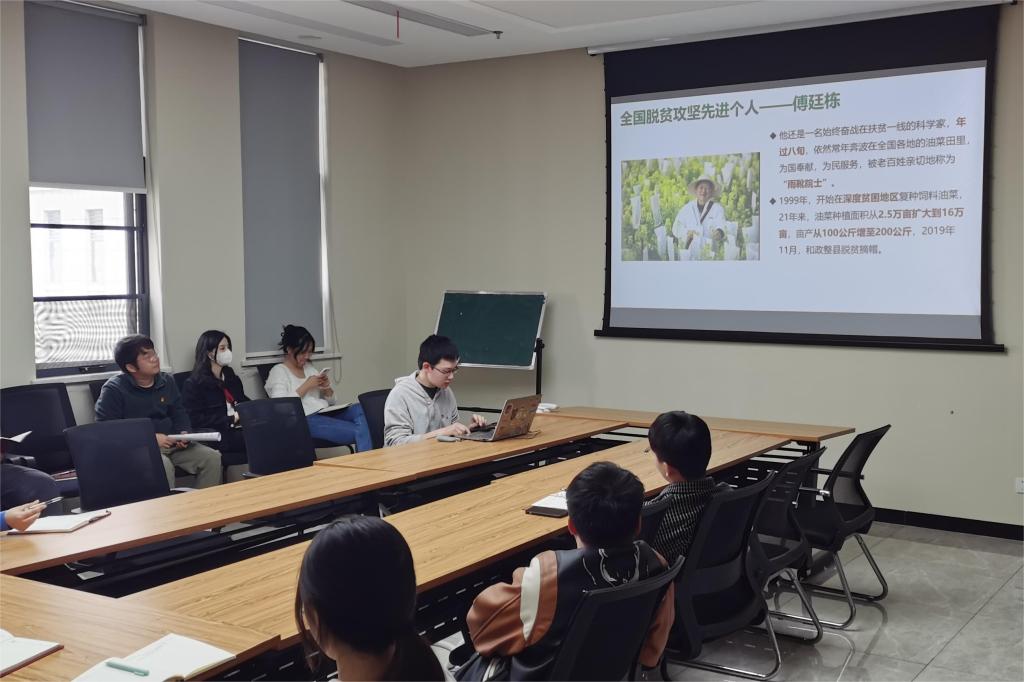 刘淏林以“砥砺脱贫攻坚路,乡村振兴谱新篇;弘扬耕读精神,助力乡村振兴”为主题分享了众多华农师生致力扶贫、助力乡村振兴的先进事迹。其中,我校研究生支教团积极搭建贫困地区与爱心企业的桥梁,开展了“水滴助学金”“爱心书屋”“暖心三个一”等公益活动,为我国教育脱贫攻坚战取得全面胜利注入华农力量。随后,他以全国脱贫攻坚先进个人傅廷栋院士、青年代表彭达、汪志全等人为例,探讨了作为农科学子应当如何弘扬“耕读精神”,助力乡村振兴。
