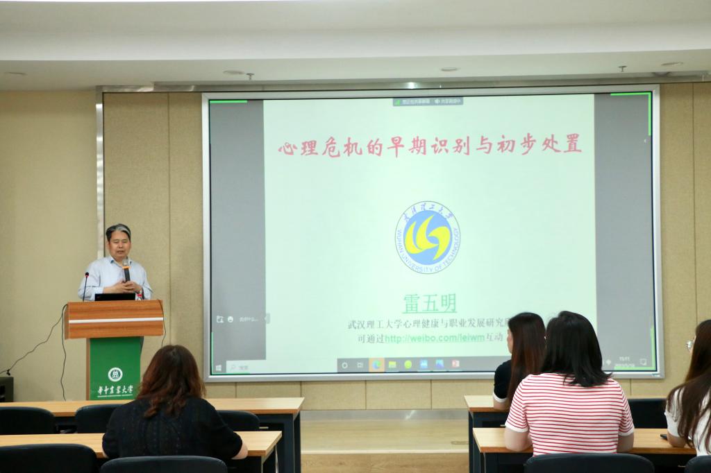 5月18日,由植科院工会、教师发展中心主办、生理生化教工党支部、农业昆虫教工党支部与行政教工党支部联合举办的心理健康讲座在第三综合楼A705线上线下同步进行。本次讲座特邀武汉理工大学特聘教授雷五明作“心理危机的早期识别与初步处置兼论和谐导学关系的建立”专题报告。学院党委书记周雄、工会主席姜海以及部分教职工代表共同参加。