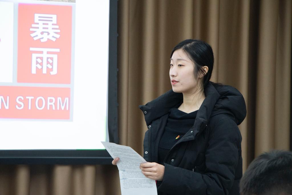 本科生党支部书记高婧雯就“再接再厉抓好灾后恢复重建确保广大人民群众安居乐业温暖过冬”进行领学。她指出返回北京前,习近平总书记对陪同人员和当地干部说,在党中央的正确决策部署下,各级各方面采取有力有效措施,把百年一遇的洪涝灾害损失降到了最低。灾后恢复重建涉及范围广,工程项目多,资金投入大。各级党委和政府、各有关部门要坚持求真务实、科学规划、合理布局,把资金用到刀刃上,高质量推进项目建设,把各项工程建设成为民心工程、优质工程、廉洁工程。高婧雯强调:“共产党是为人民服务的党,永远把老百姓放在心中最高位置,无论是抢险救灾还是灾后恢复重建,都会全力以赴。在党中央坚强领导下,只要大家齐心协力,就一定能够重建家园,过上更加美好的生活。”