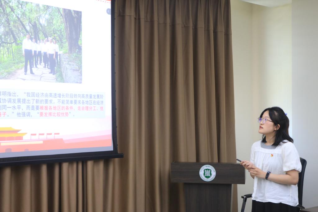 作物栽培专业研究生第一党支部书记朱贺洁就“中央党的建设工作领导小组会议精神”进行领学,她讲到:“我们要深入学习贯彻习近平总书记的重要讲话和重要指示精神,落实《通知》要求,深刻领悟‘两个确立’的决定性意义,坚决做到‘两个维护’,切实把思想和行动统一到党中央决策部署上来。”植物病理专业研究生第五支部书记张雅诗围绕“不断迈上新台阶,奋力谱写新篇章”这一主题,详细介绍习近平总书记在新时代推动西部大开发座谈会上的重要讲话。她谈到:“‘西部大开发’是中华人民共和国中央政府的一项政策,目的是把东部沿海地区的剩余经济发展能力,用以提高西部地区的经济和社会发展水平、巩固国防。”