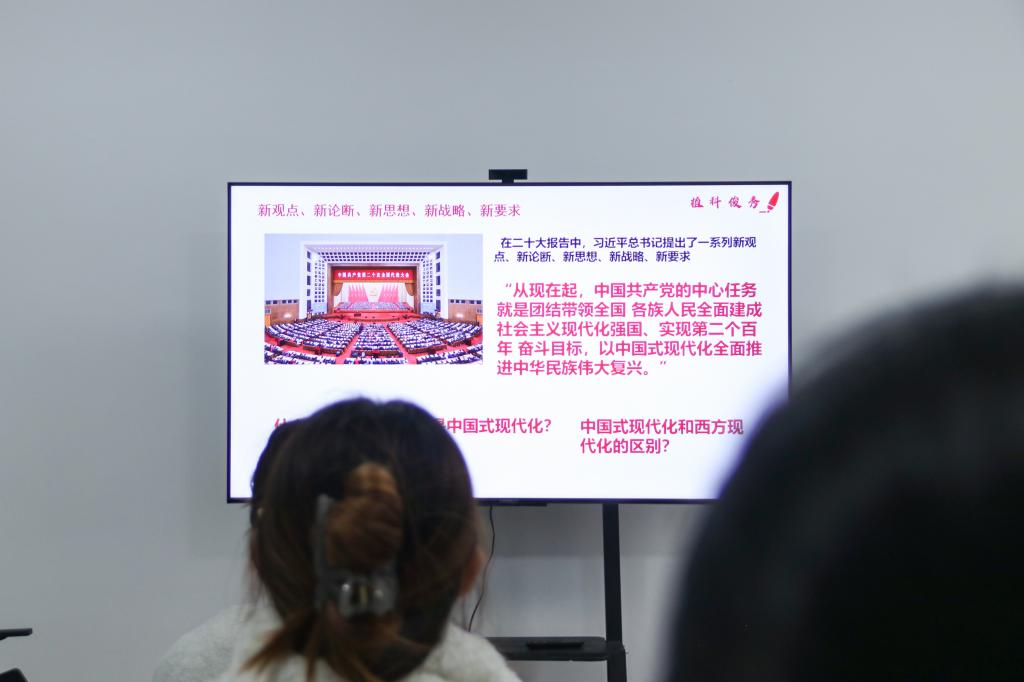 本次学习围绕党的二十大会议中的“新观点、新论断、新思想”展开,练人杰以关键词的形式,为大家领学了“中国式现代化”的内涵与发展优势,从“什么是现代化”、“什么是中国式现代化”、“中国式现代化与西方现代化的区别”三方面出发,阐述了“中国式现代化”的特点。