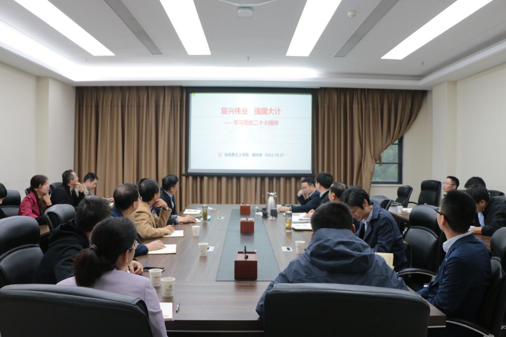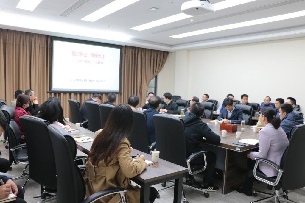 10月27日下午,学院在三综B308会议室开展党的二十大精神“精读精讲”活动,马克思主义学院党委书记程华东应邀作“复兴伟业,强国大计”学习辅导报告,学院班子成员、师生党支部书记等参加学习会,会议由党委书记周雄主持。