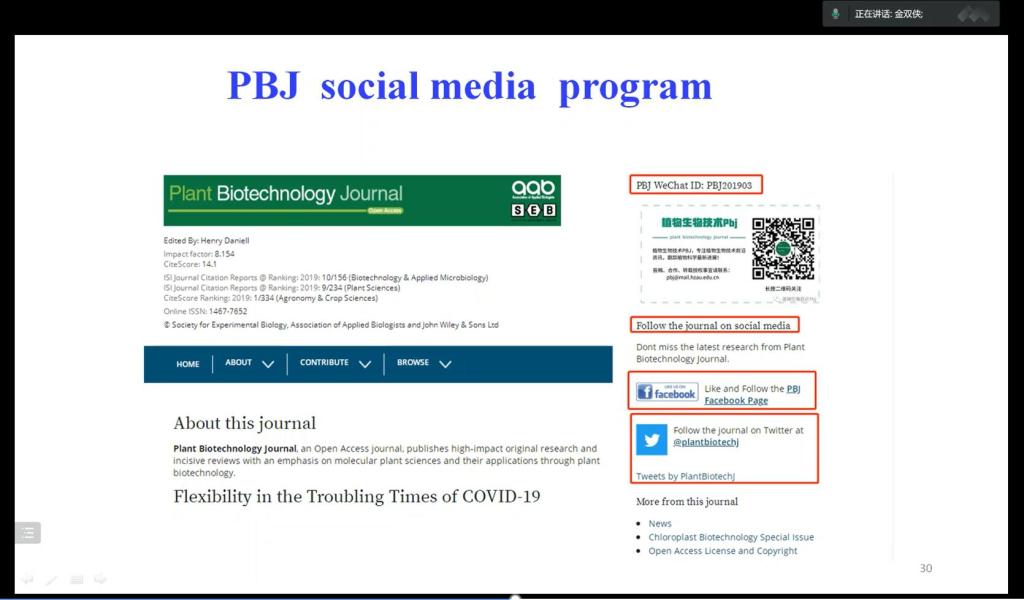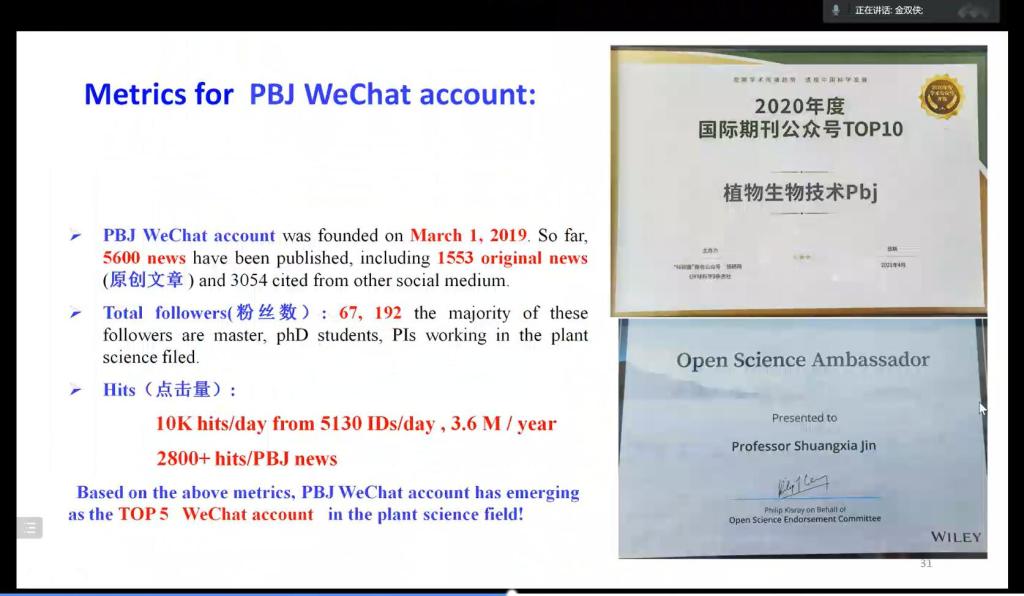作为学术期刊Plant Biotechnology Journa》的主编,金双侠深刻认识到学术平台对于科技创新的重要性。他从自身的经历入手为大家分析了占领学术平台的重要性,他指出,《PBJ》作为植物生物技术杂志,旨在发表应用植物科学领域领先研究人员的高影响力原创性研究,而在创刊初期,中国学者的科研成果却在杂志内容中占比很少,“主要原因在于中国编辑少、审核门槛较高”。针对这一限制因素,金双侠积极邀请中国专家参与编辑审稿,并创新期刊发布形式,创建微信公众号拓宽传播面积、提高杂志影响力。他强调,“努力利用社交媒体及国际学术期刊增加科技成果的发表与展示,能够有效提升中国学者的话语权。”