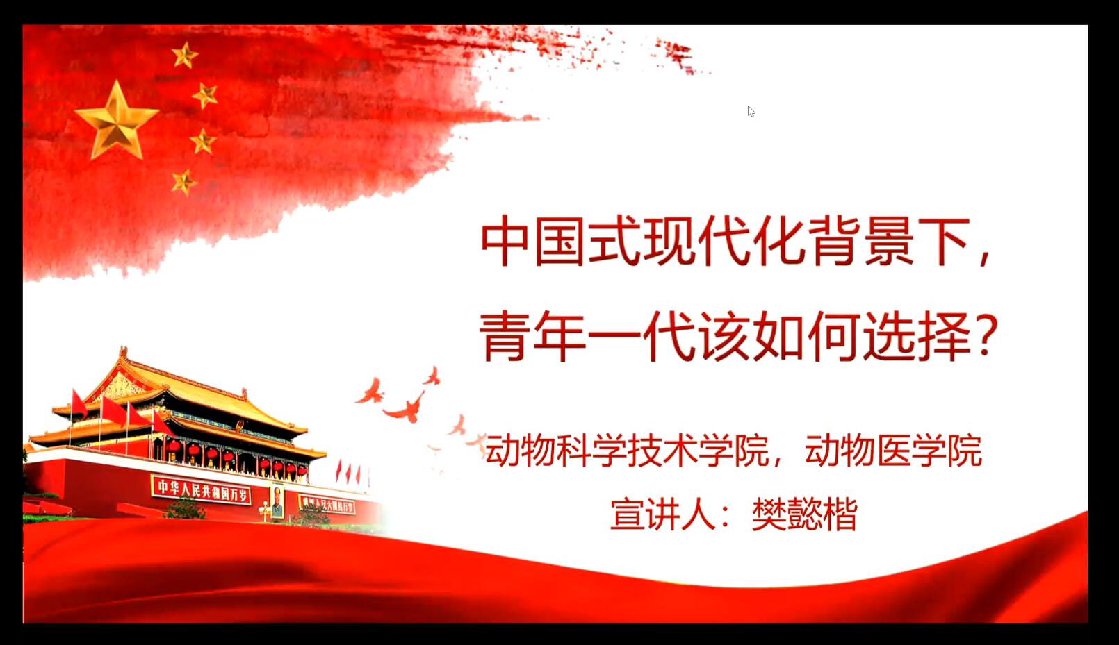 12月12日晚学习贯彻党的二十大精神我校青年讲师团成员动科动医学院博士生樊懿楷中国式现代化背景下青年一代该如何选择为主题面向智农2201团支部智农2206团支部植生2210团支部讲述他对于中国式现代化青年选择的理解与感受