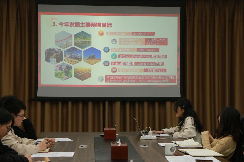 徐婷婷围绕过去一年工作回顾、过去五年工作成效、今年发展主要预期目标和社会发展工作重点以及青年如何担当作为进行了分享交流。她表示,过去一年是党和国家历史上极为重要的一年,党的二十大胜利召开,全面建设社会主义现代化国家的宏伟蓝图跃然浮现。“我国经济发展遇到疫情等国内外多重超预期因素冲击,国家和政府有针对性地从多个方面采取措施强有力地应对新的经济下行压力,在攻坚克难中稳住了经济大盘,在复杂多变的环境中基本完成全年发展主要目标任务,我国经济展现出坚强韧性。”她谈到,“五年来,党和国家深入贯彻以习近平同志为核心的党中央决策部署,我国经济发展再上新台阶,脱贫攻坚任务胜利完成,科技创新成果丰硕,经济结构进一步优化,基础设施更加完善,改革开放持续深化,生态环境明显改善,人民生活水平不断提高。”